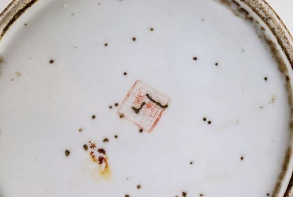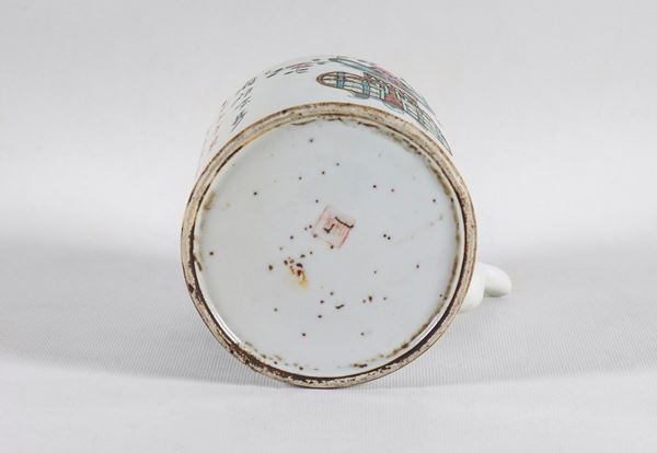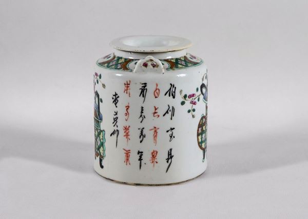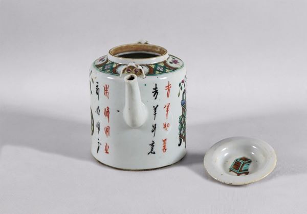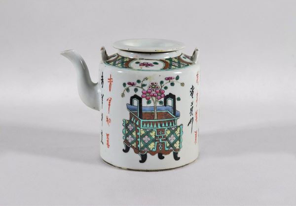 Antica caffettiera cinese in porcellana con decorazioni in smalto a rilievo a motivi di vasi e fiori