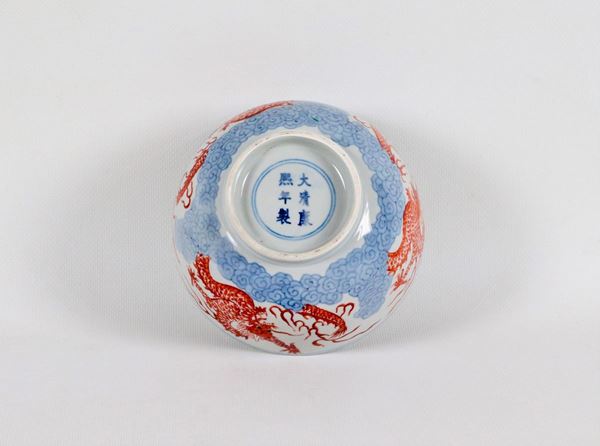 Antica ciotola cinese per riso in porcellana con decorazioni di draghi smaltate a rilievo