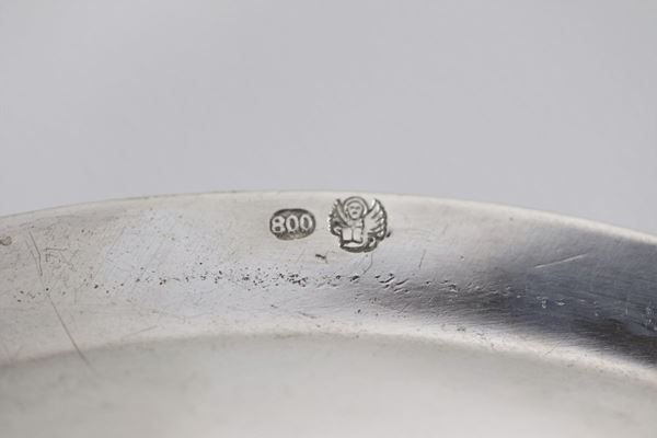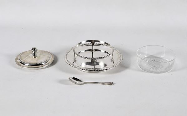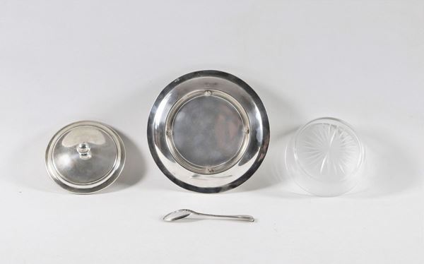 Antica formaggiera in argento sbalzato con vaschetta in cristallo e cucchiaino gr. 330
