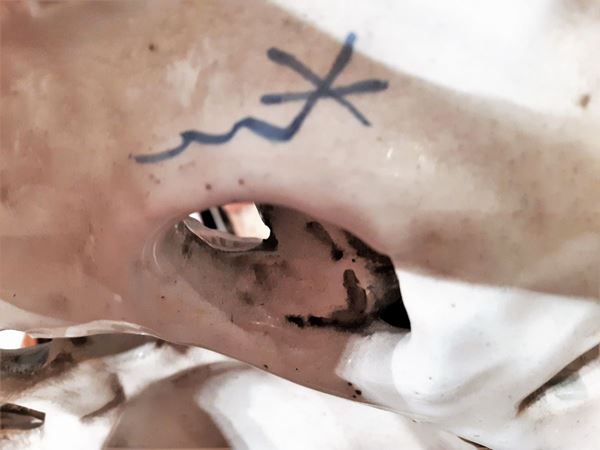 Antica specchiera in maiolica smaltata "Le Nove" Bassano decorata e variopinta a motivi di ghirlande floreali, statuina di putto e teste di [..]