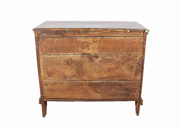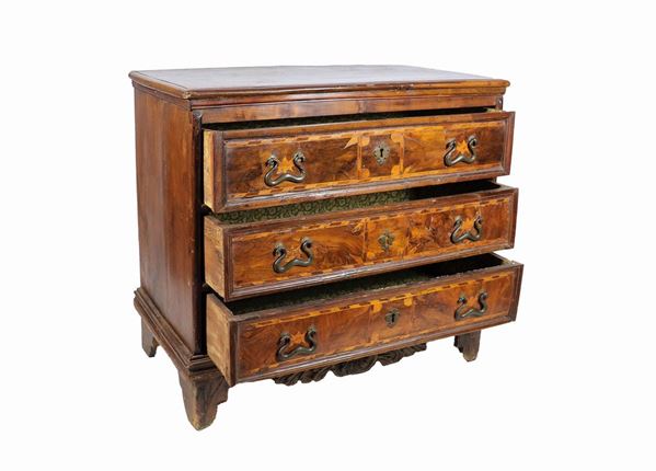 Antico canterano di linea Luigi XIV in noce con intarsi in bosso