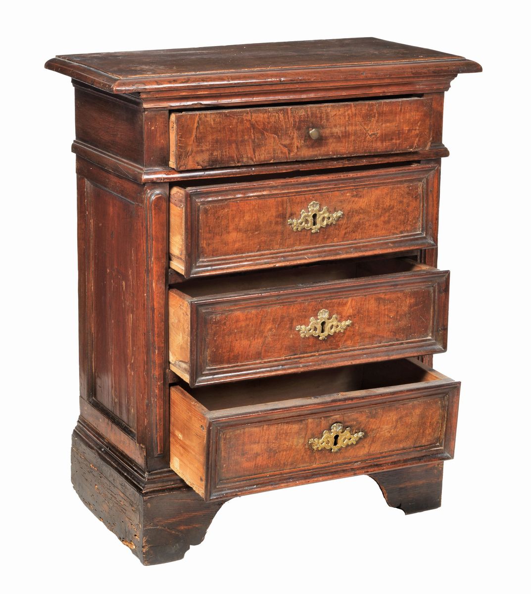 Antico comodino romano Luigi XV in noce con quattro tiretti e bocchette in bronzo dorato e cesellato