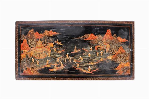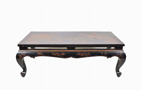 Antico tavolo da salotto giapponese con piano decorato e variopinto con scene di vita di un villaggio, quattro gambe ricurve