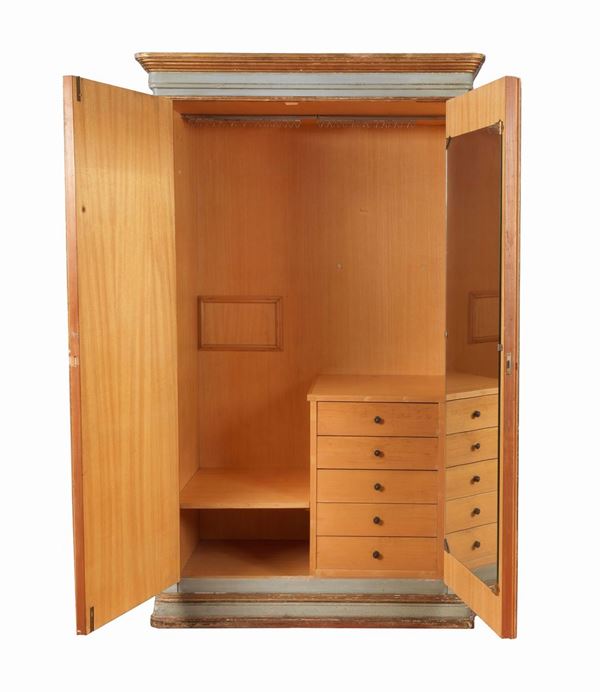 Armadio marchigiano a due sportelli in legno laccato verde e dorato con riquadri a bugnature di linea Luigi XIV