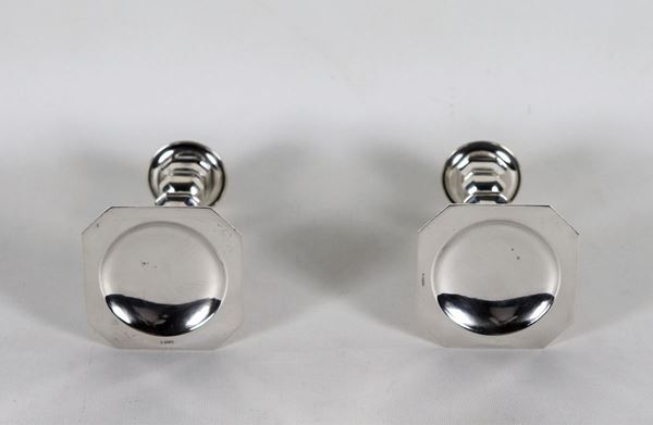Coppia di piccoli candelieri in argento cesellato e sbalzato gr. 480 circa