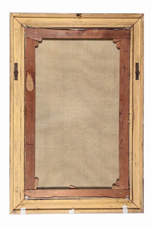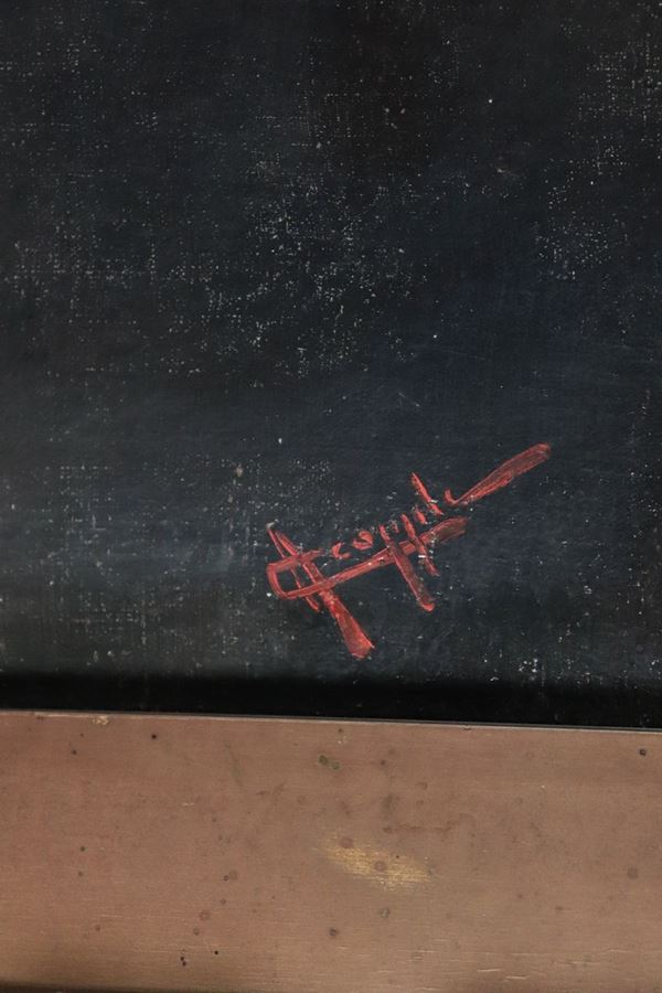 opera dell'artista napoletano che studiò all'Accademia di Belle Arti di Napoli, specializzandosi nella tecnica della pittura a tempera e a olio e nella realizzazione di pergamene all'acquerello. Ad Atene per circa due anni , quindi a Bari, ove ottenne un discreto successo come ritrattista, poi di nuovo a Napoli ed infine a Roma nel 1883 dove espose all'Esposizione Nazionale. Tra le sue opere più interessanti ricordiamo "Cristo", "Le castagne sotto la brace" e "Dopo un mezzo litro", esposto a Firenze nel 1883 alla Promotrice. Cornice in legno dorato, cm 105 x 64.