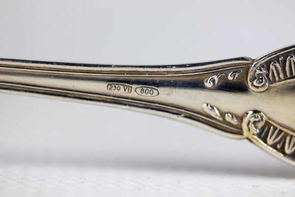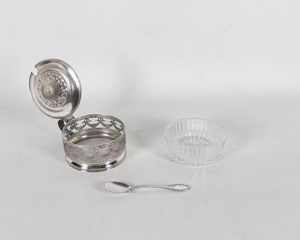 Formaggiera tonda in argento cesellata e sbalzata a motivi Impero con vaschetta in cristallo e cucchiaino gr. 85