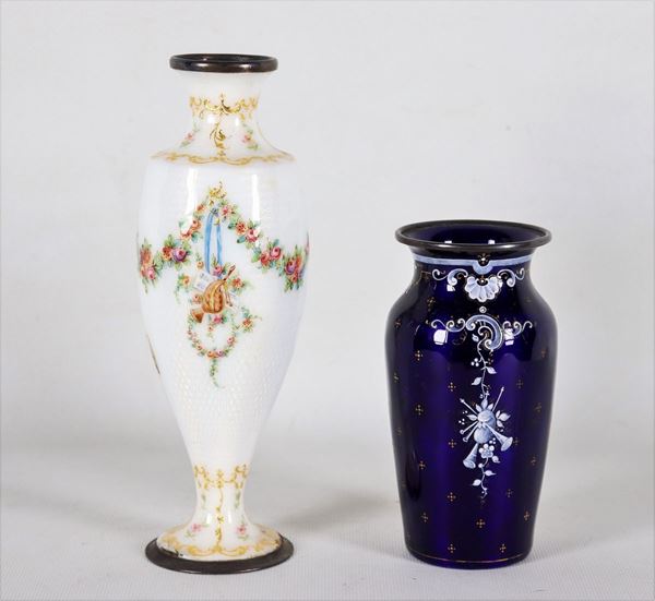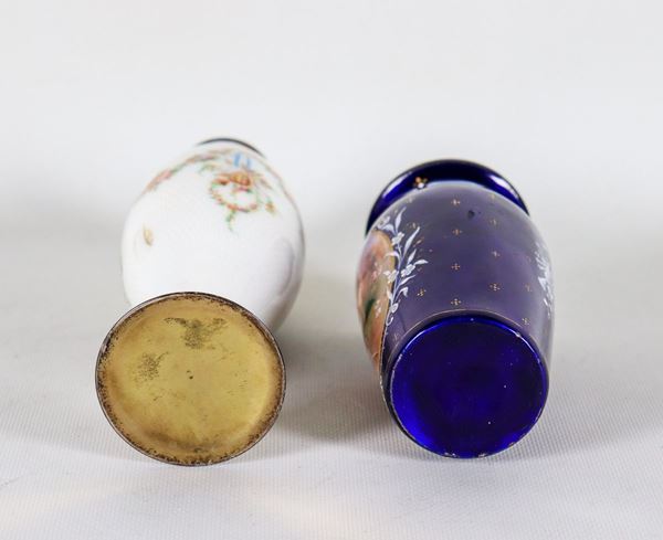 un vasetto in smalto blu cobalto con medaglione dipinto con figura di putto, un vasetto in smalto bianco con fiocchi e ghirlande floreali dipinti. Lievi difetti, altezza massima cm 21.