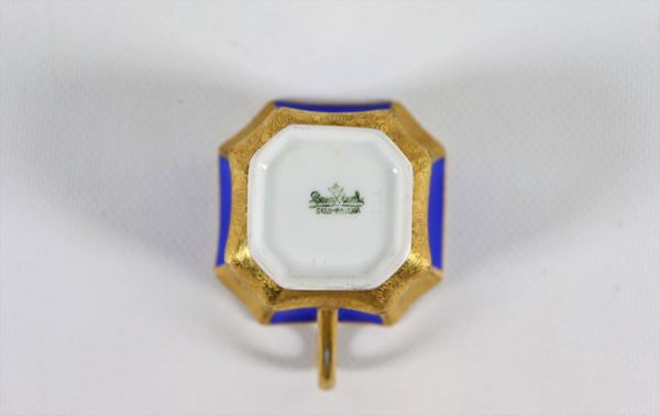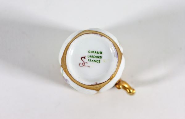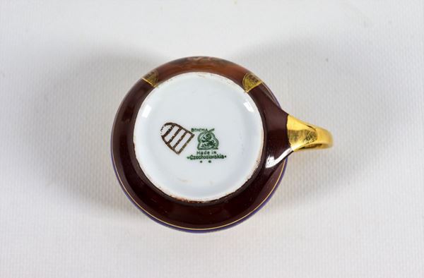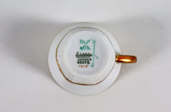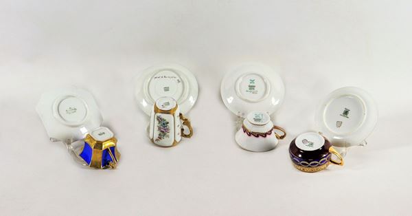 Lotto di quattro tazzine con piattini in porcellana policroma Ginori, Rosenthal, Boemia e Limoges
