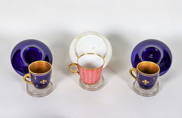 Lotto di tre tazzine con piattini in porcellana a varie policromie