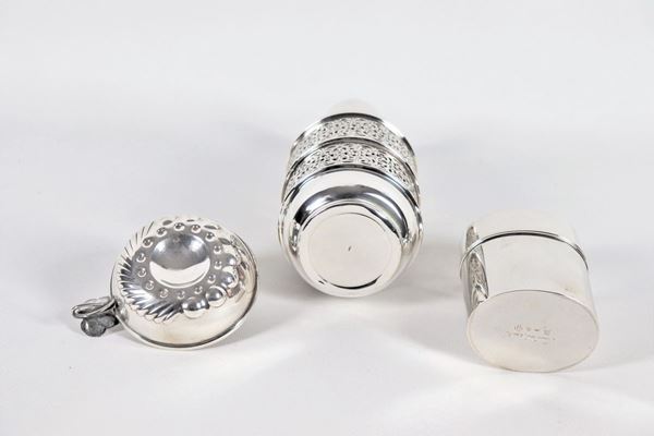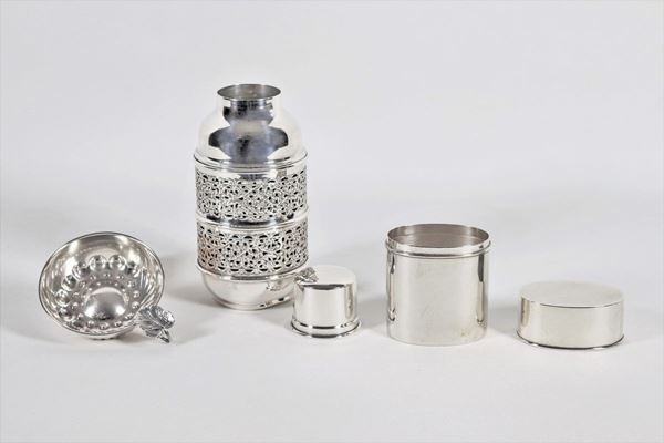 composto da: 1 coppetta assaggiavino, 1 shaker mancante del vetro interno e una scatola ovale portasigarette. Altezza massima cm 19.