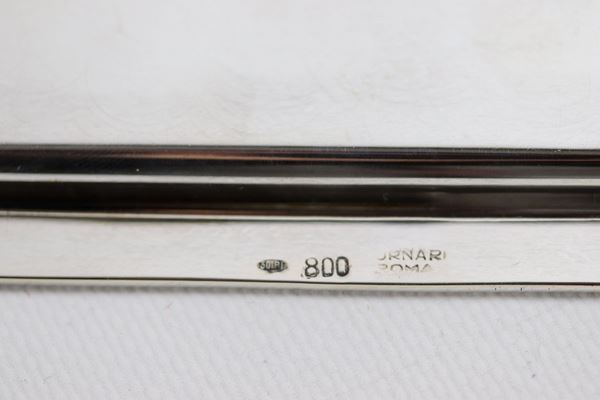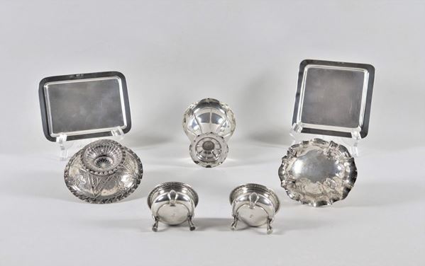 Lotto in argento cesellato e sbalzato di due piattini, due salierine tonde, una vaschetta ovale, un'alzatina tonda e un vasetto (7pz) gr. 490 [..]