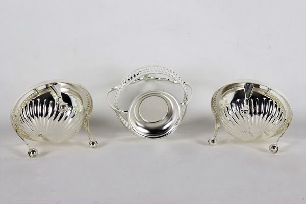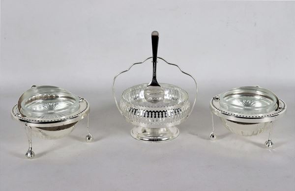 Lotto in metallo argentato e sbalzato di due portaburro e un portamarmellata con vaschetta in cristallo.