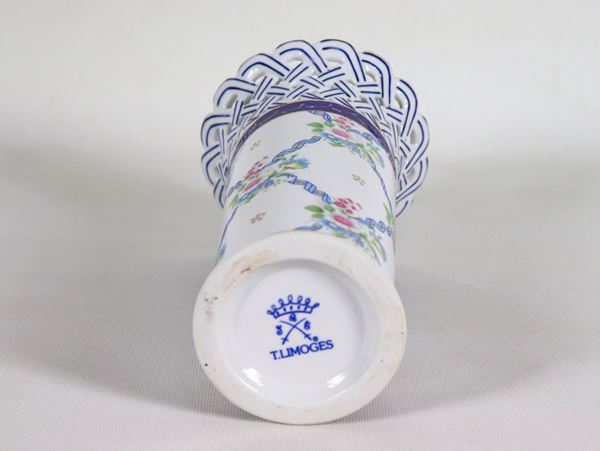 Piccolo vaso francese in porcellana di Limoges bianca e blu