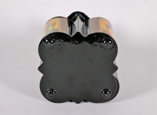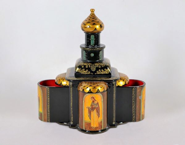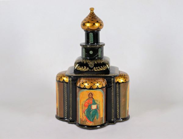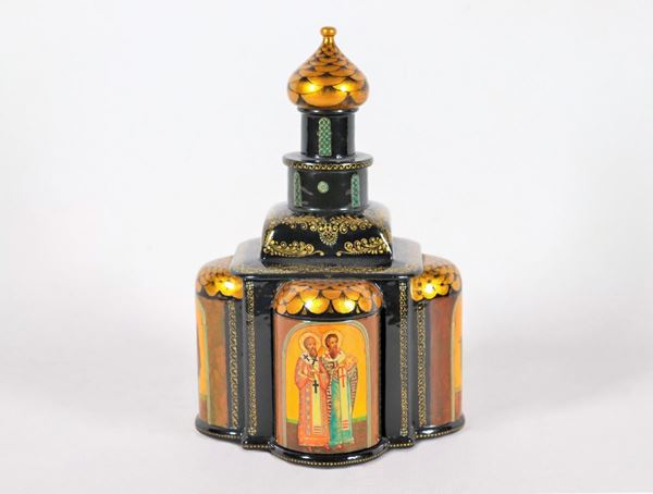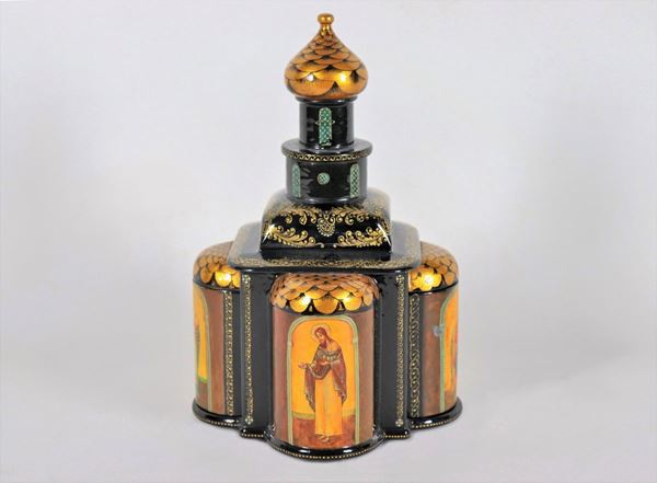 Scatola russa a forma di chiesa ortodossa in legno laccato nero e oro con immagini policrome di "Santi"
