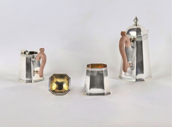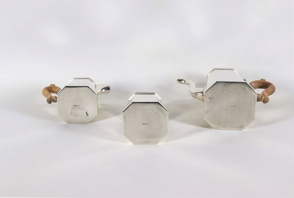 Servizio da caffè in argento a forma ottagonale sfaccettata con manici in legno (3pz). Titolo dell'argento 925 gr. 1520