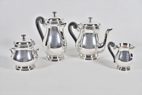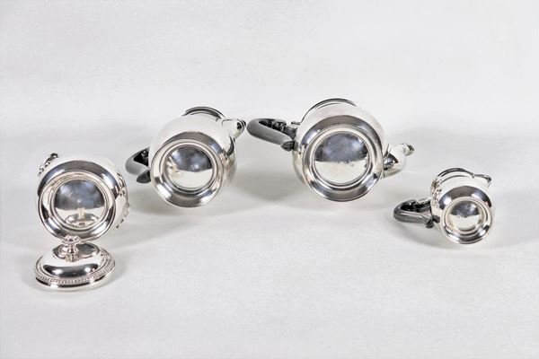 Servizio da tè e caffè in metallo argentato con profili perlinati e manici ebanizzati (4 pz)