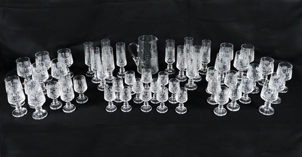 composto da: 1 brocca, 9 bicchieri per acqua, 9 per vino, 12 flute, 10 per liquore e 12 per rosolio.