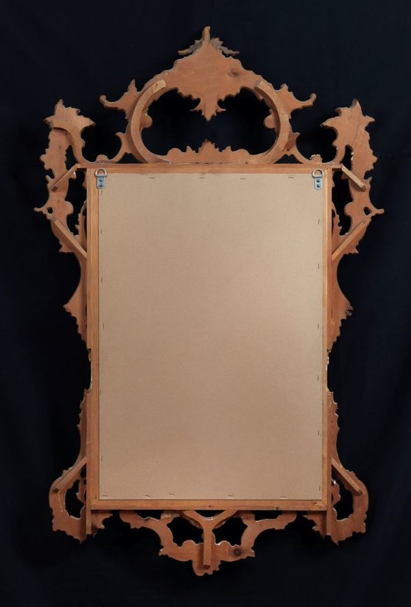 Specchiera in legno dorato ed intagliato a motivi Lugi XV a volute di foglie d'acanto, fiori e ricci