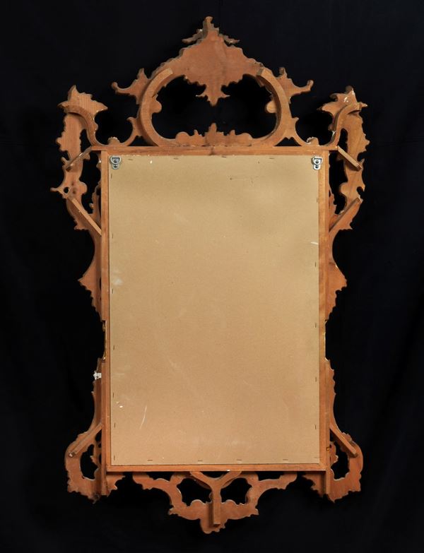 Specchiera in legno dorato ed intagliato a motivi Luigi XV a volute di foglie d'acanto, fiori e ricci