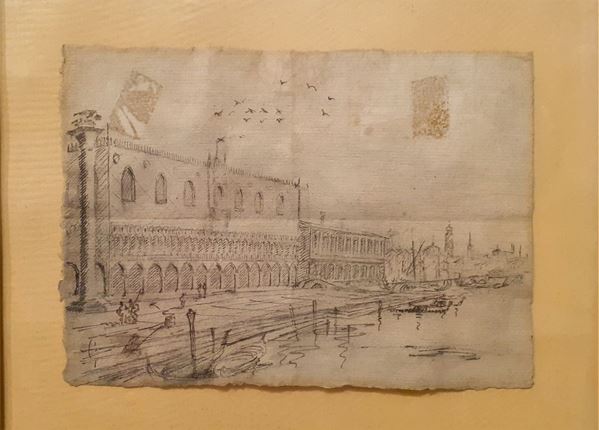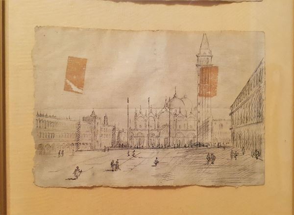 Tre antichi piccoli disegni a penna su carta "Vedute di Venezia" racchiusi in unica cornice