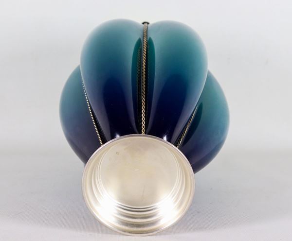 Vaso in vetro soffiato di Murano verde scuro e giallo con applicazioni e base in argento