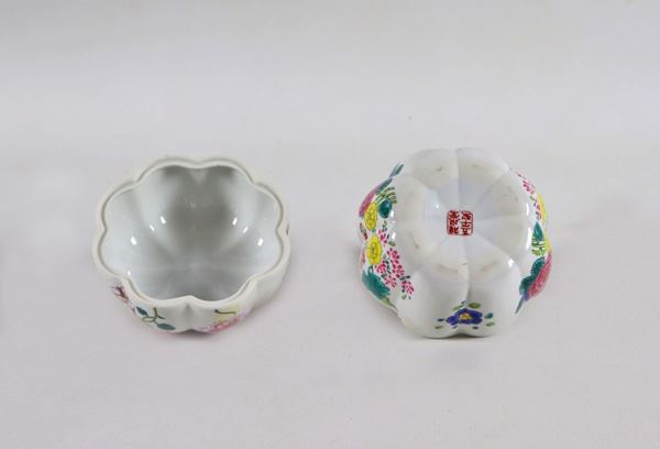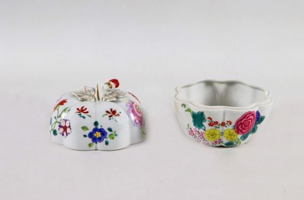 Zuccheriera cinese a forma di zucca in porcellana con decorazioni policrome a rilievo a motivi di fiori esotici