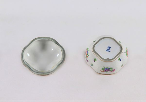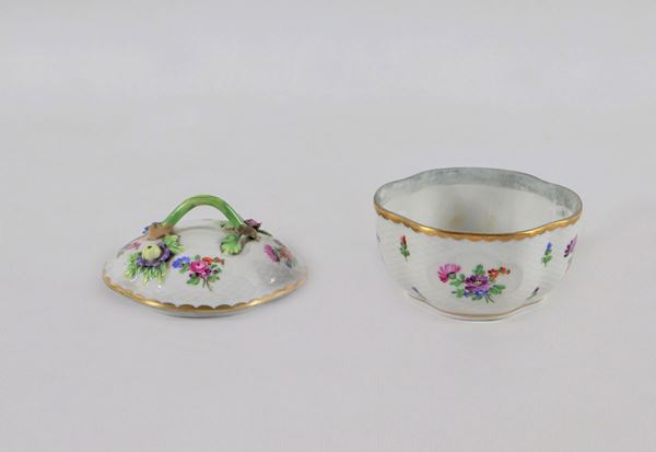 Zuccheriera ovale in porcellana tedesca Dresden con decorazioni dipinte a motivi floreali