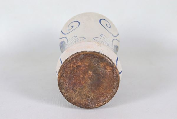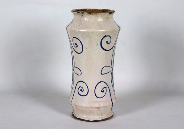 Albarello in maiolica smaltata di Faenza, con decorazioni in blu turchino e giallo