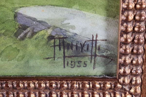 Firmato e datato 1955. "Veduta dell'Appia Antica con ruderi", acquarello su carta