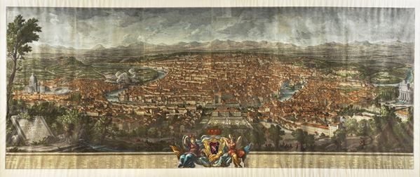 Antica grande incisione a colori "Prospetto della Città di Roma visto dal Monte Gianicolo e sotto gli auspici di Carlo III Re delle Spagne"