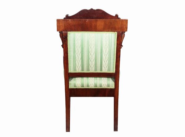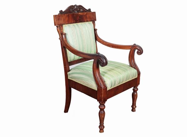 Antica poltrona toscana Impero, in mogano e piuma di mogano, con braccioli ricurvi e schienale rettangolare sormontato da cimasa intagliata