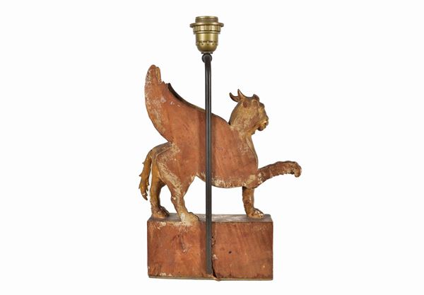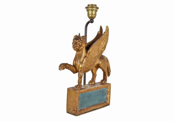 Antica scultura in legno dorato e laccato "Leone alato"
