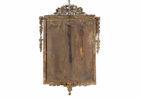 Antica specchiera di linea Luigi XVI, in legno dorato ed intagliato a cordoni intrecciati e calatine di fiori, sulla cimasa corona nobiliare. [..]