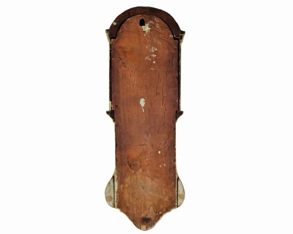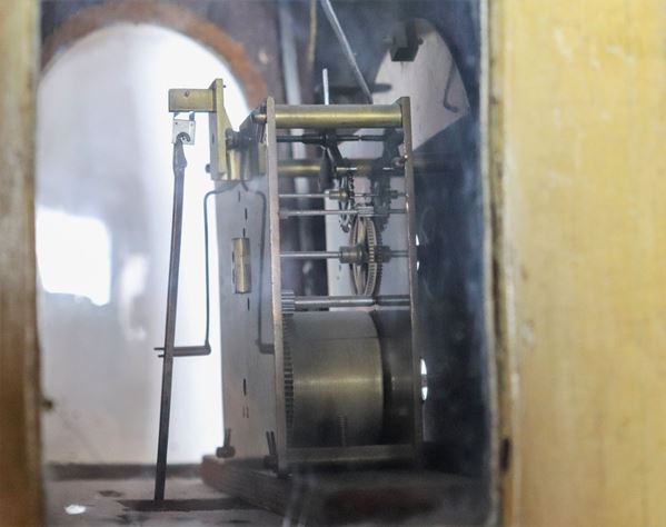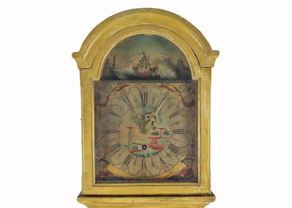 Antico orologio da muro in legno laccato, con quadrante decorato e dipinto sormontato da mezzaluna con automi di velieri nel porto