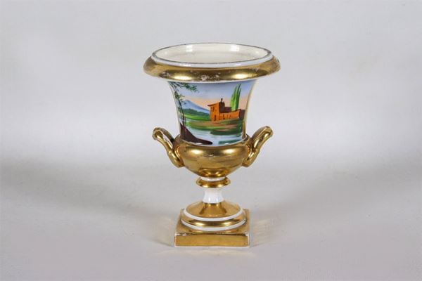 Antico piccolo vaso napoletano a cratere, in porcellana decorata in oro zecchino con scene dipinte di "Paesaggio" e "Incontro galante"