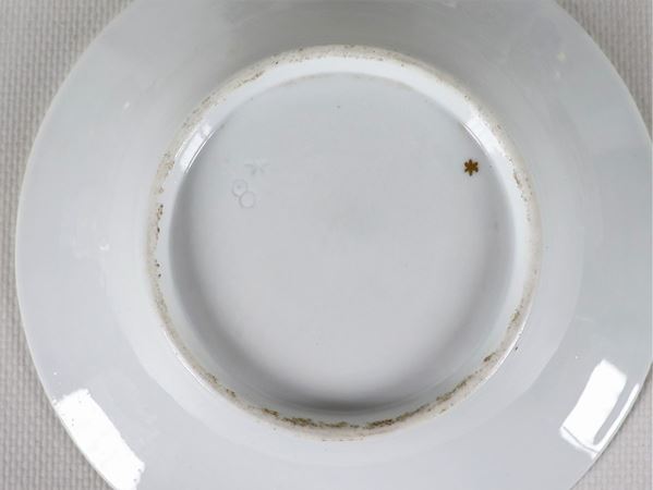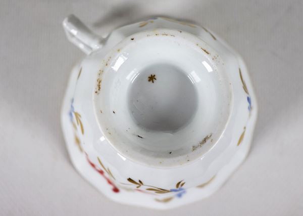 Antico servizio da caffè in porcellana Vecchia Parigi, con decorazioni policrome a volute e fiori e lumeggiature in oro zecchino (8 pz)