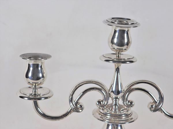 Candelabro in metallo argentato, sbalzato e cesellato a 3 fiamme