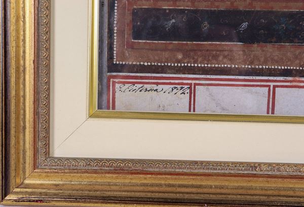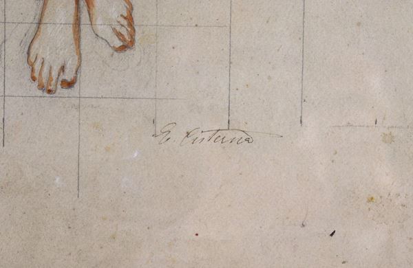 Firmato e datato 1892. "Madonna con Bambino, Sant'Agnese e Santa Emerenziana" disegno su carta all'acquarello e biacca