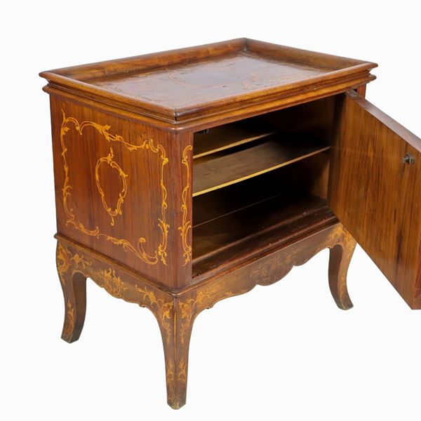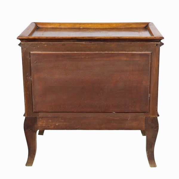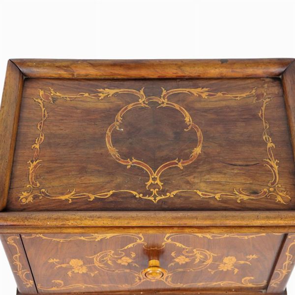 Comodino lombardo in noce con intarsi in bosso a volute ed intrecci floreali