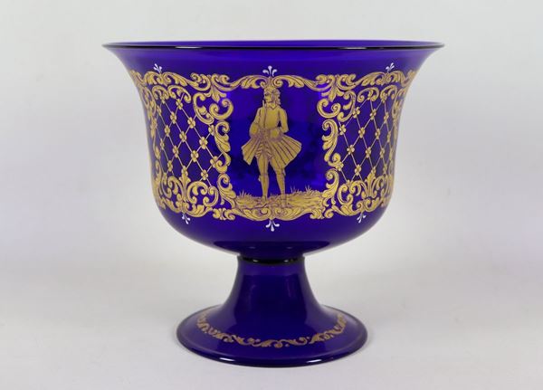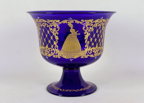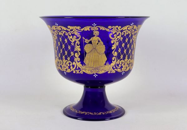 Coppa in vetro soffiato di Murano blu cobalto con decori in oro zecchino