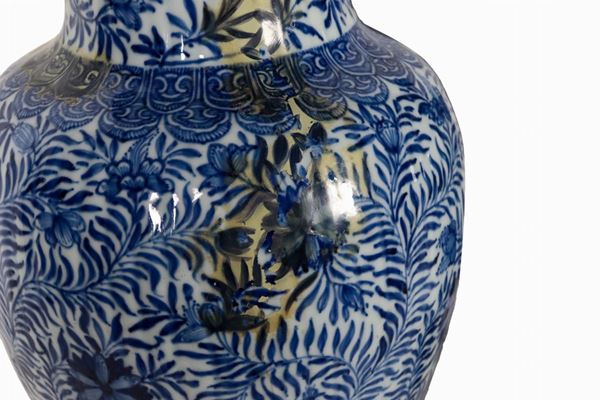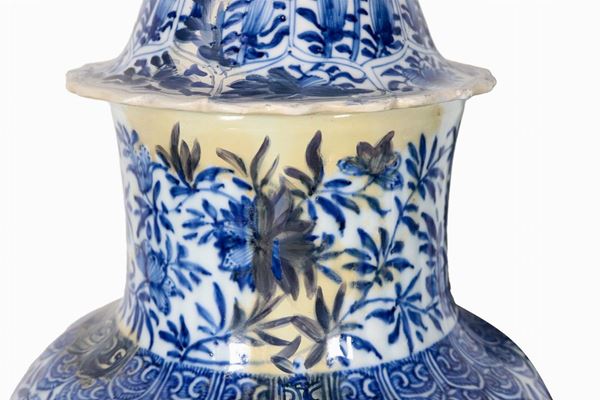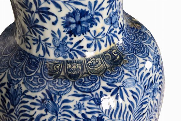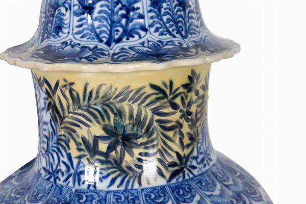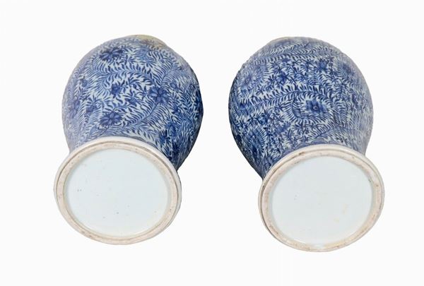 Coppia di antiche potiches cinesi in porcellana, con decorazioni in blu a motivi di fiori e foglie orientali
