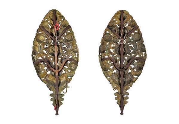Coppia di appliques 'Palme' in rame dorato, sbalzato e cesellato a motivi di foglie e fiori