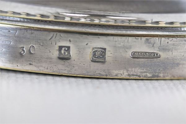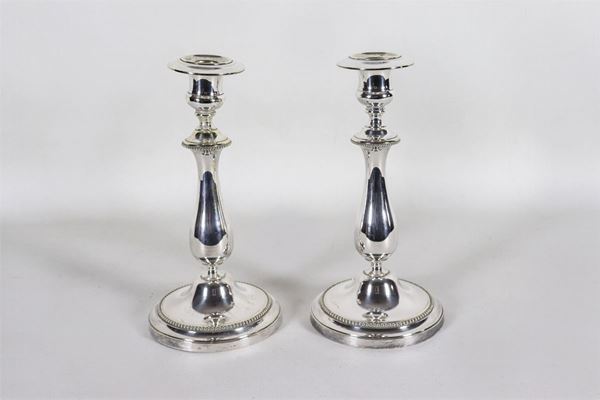Coppia di candelieri francesi in metallo argentato Christofle con profili perlinati