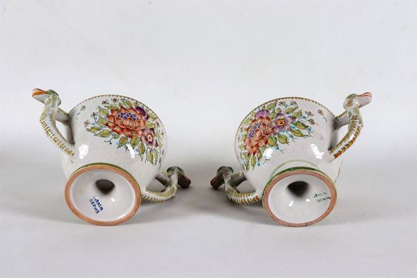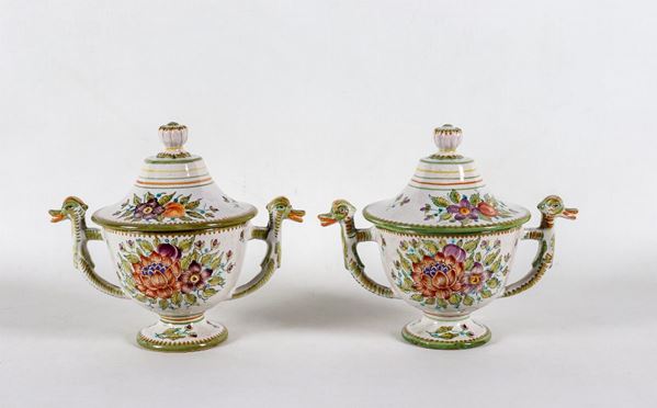 Coppia di piccole zuppiere in ceramica smaltata policromata di Deruta, con decorazioni a motivi di fiori e frutta
