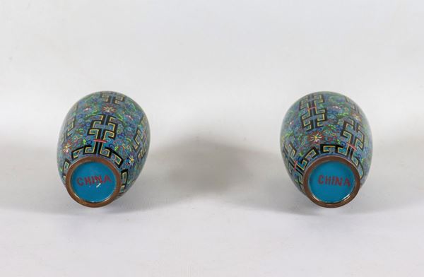 Coppia di piccoli vasi cinesi in smalto cloisonnè, decorati a rilievo a motivi geometrici e floreali