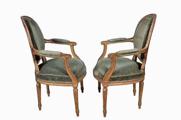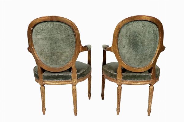 Coppia di poltrone francesi Luigi XVI, in legno dorato ed intagliato a rilievo a motivi di cordoni, foglie d'acanto e rosoni