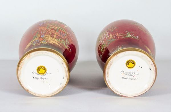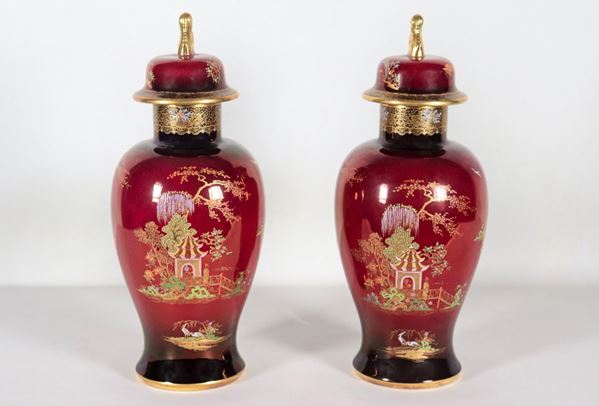 Coppia di potiches inglesi in ceramica porcellanata, con decorazioni in smalti a rilievo a cineserie