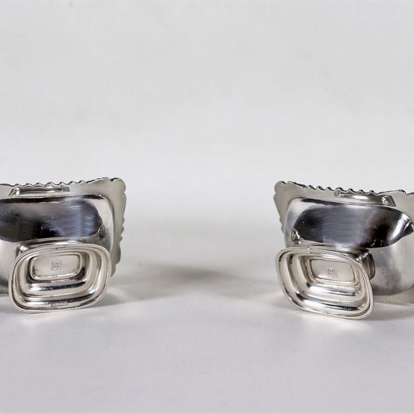 Coppia di saliere inglesi in sheffield "a barchetta" con bordo cesellato e sbalzato