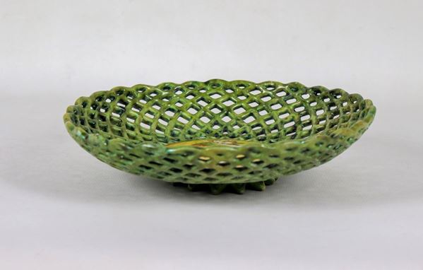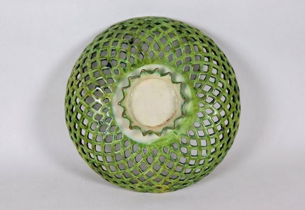 Crespina in maiolica smaltata di Faenza, a forma di cesto traforato, con al centro putto a compendiario